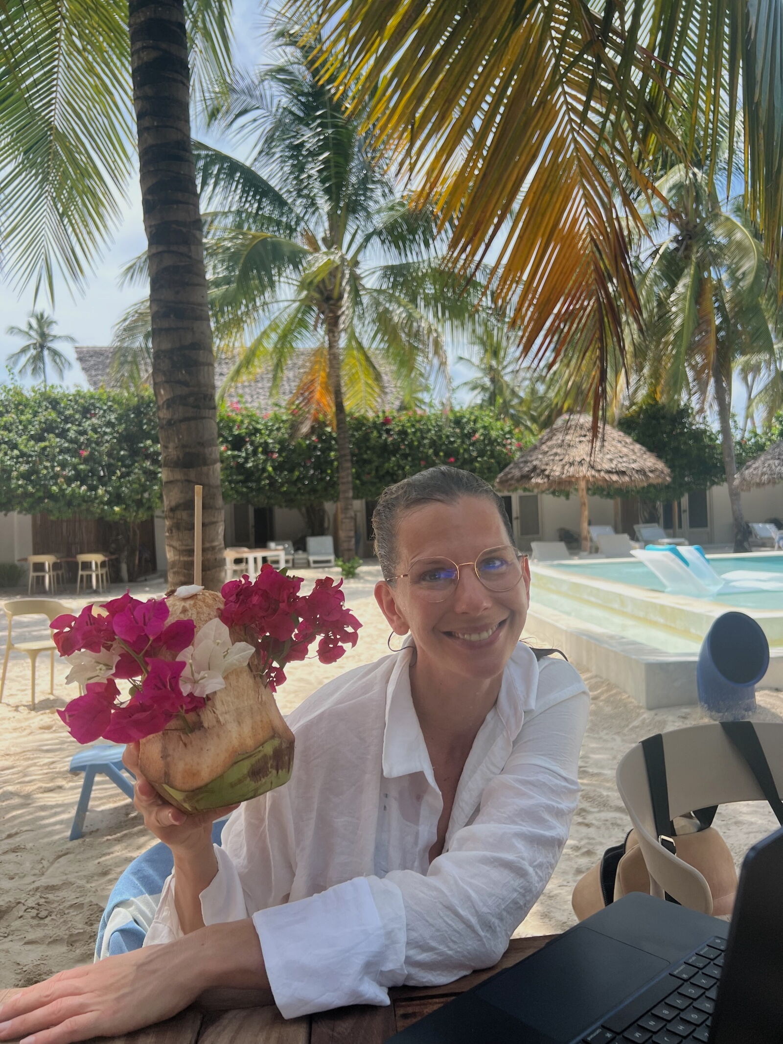 Klaudia hat zusammen mit ihrer Mitarbeiterin Fabienne zwei Wochen Workation auf Sansibar genossen und genutzt, um in Ruhe an der strategischen Ausrichtung des Unternehmens zu arbeiten sowie die ToDo-Liste zu leeren.